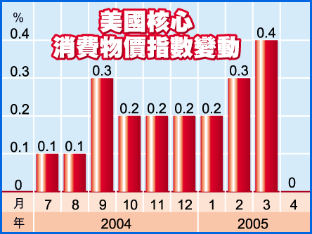 由於食品和能源價格大漲,美國4月份消費物價指數(CPI)升0.5%,增幅較3月的0.6%溫和,但大過市場估計的0.4%升幅。核心CPI於3月升0.4%後,4月份無變動(市場原先預期升0.2%),且是03年11月以來首次無增長,反映成衣和酒店房租大幅跌價。