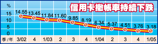 根據最新公布,信用卡撇帳額繼續減少,首季撇帳額4.6億元,佔平均應收帳款的0.8%,年度化撇帳率為3.18%,是自1998年第三季以來的最低水平。拖欠比率則微升,從04年12月底的0.44%升至0.45%,主要是信用卡應收帳款總額減少所致。