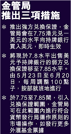 【本報訊】為了趕退因炒賣人民幣升值而湧入本港的熱錢,令港息能跟隨美息上升回復正常水平,金管局繼九八年推出七招後,昨日又出三招,包括推出雙向兌換保證及將港元偏弱時的兌換保證價,由目前的七點八逐步移向七點八五,是八三年起聯滙實施以來,七點八滙率下限承接水平首次下調。措施料可令本地炒賣人民幣及港滙的投機活動減少,消息公布後,大量資金即時流出本港,本港未來一周勢將加息。 記者:劉美儀