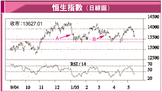 港股跌勢雖然稍為緩和,可是綜觀過去6個月恒指的走勢,13600基本上不是一個太強的支持水平,同時大市較少在13600水平出現止跌回升,反而進一步下試13300水平的機會較高,正如圖中的A、B兩點,當時恒指下試至13600-13700水平後,略作反彈或喘定,隨即大市又再進一步下探13300水平支持。再加上近日14RSI已失守50水平,並正持續滑落,故相信後市頗大機會反覆下試13300水平才有較大支持。最後,在昨日滙控除息後,現尚餘恒生(011)有除息問題,故近日期指的高低水現象,將更為清晰,並更具參考性!
