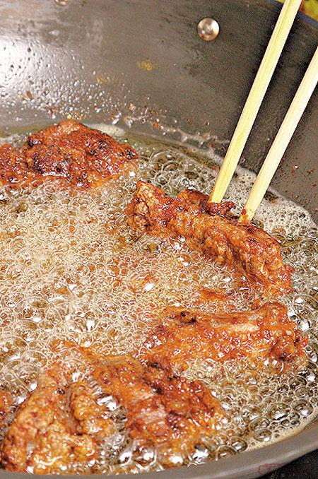 要排骨內外都有美祿香味,醃及炸時都要有美祿粉。而且先猛後慢火,排骨至香脆。