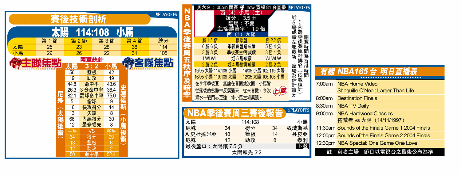 尼殊以個人季後賽首個三雙成績──三十四分、十三個籃板及十二次助攻,證明自己當選MVP是實至名歸;並以能攻、能守、能傳的表現,帶領鳳凰城太陽周三在主場以一百一十四比一百○八壓過達拉斯小馬,在西岸四強戰總成績領先三比二。不過今回只輸數分的小馬,下戰重返主場少讓三分半,有力扳成平手,決捧上盤。(now寬頻84台明日9:00am直播第6場)