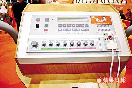 用以訓練肌肉的BodyTransformer電子儀器,發出電波刺激肌肉反應及收縮,建議每星期使用2至3次,每次30分鐘,訓練針對手腳及腰等8個部位,整套器材售價15萬港元。