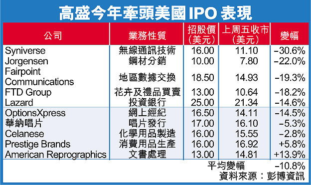 高盛今年牽頭的美國IPO共10宗,可是其中8隻股票正在「潛水」,股價較招股價平均跌去10.8%(見表),在各大華爾街大型證券行中表現最差,跑輸其最大競爭對手摩根士丹利,後者牽頭IPO的股票平均升近4%。