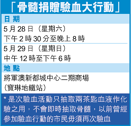 日前,嘉詠與母親從澳門來港,到瑪麗醫院進行身體檢查及抽血化驗,她在完成檢查後,將於明早返回澳門,故未能出席骨髓驗血大行動,惟母女不忘同心呼籲。