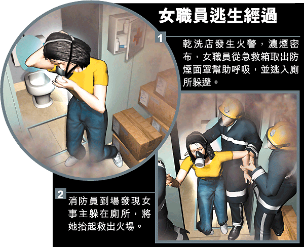 當時,幾名煙帽隊消防員一直跑至乾洗店盡頭的廁所,推開只有一個廁格的廁所門,果然見女職員手持防煙面罩罩着口鼻呼吸,她當時非常驚慌,見到消防員出現如見救星,馬上舉起雙手,大哭叫嚷:「救命呀!」幾名消防員合力將她抬起,並用本身的氧氣罩給女事主呼吸,然後奔出乾洗店。