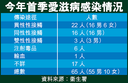 該署特別預防計劃顧問醫生黃加慶表示,六十五名感染者中,二十二人透過異性性接觸感染,數目似乎有下降趨勢;但透過同性性接觸及雙性性接觸感染的人數共十九人,全是男性,較透過異性性接觸感染的十六名男士為多。他又指,這是有紀錄以來第三次錄得此情況,早前兩次分別在去年第一季及第三季錄得。另有一名非本地人士在本港以外地方輸血時感染病毒。