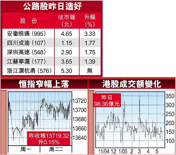 另外,公路股普遍造好,主要受稅務總局將公路經營商的通行費收入營業稅率由5%下調至3%的消息刺激揚升,其中以皖通高速(995)升幅最顯著,升3.33%(見表)。