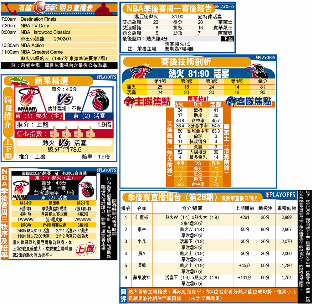 挾主場之利、九天養精蓄銳、奧尼爾復出、加上連勝八場的銳勢,最終都救不了邁亞密熱火。該隊周一在東岸決賽揭幕戰以八十一比九十慘負衞冕盟主底特律活塞。然而,吸取首戰滑鐵盧的沉痛教訓後,相信熱火第二戰必定強勢反撲,一雪前恥。(有線62台明日8:00am直播)仙道彬