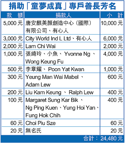 「蘋果基金童夢成真」行動於○一年四月成立,致力滙聚善長捐款與支持,為弱勢家庭的孩子實現夢想。 該行動曾經安排孩童免費登船觀賞中華白海豚、暢遊海洋公園、欣賞電影及舞台劇等,另曾送贈衣服、波鞋、益智圖書、英文字典及書包,迄今已令超過九百位孩子夢想成真。 「童夢成真」專戶捐款編號:C0121