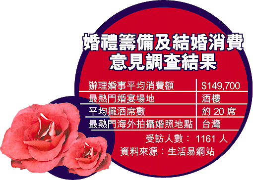 生活易網站聯同城巿大學今年三月至四月進行「婚禮籌備及結婚消費意見」調查,成功訪問一千四百六十一名將於一年內結婚人士。城大優質評估研究中心主任梁君國昨公布結果指出,受訪準新人預算花費辦理婚事(不計置業)的金額,平均高達十四萬九千多元。以去年逾四萬對新人在港註冊結婚計算,他們在結婚消費巿場的開支高達六十二億元,較○二年的四十八億暴增十四億元。