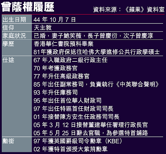 【本報訊】聲言參選要面向全港七百萬市民的曾蔭權,邀請了在政經界舉足輕重的東亞銀行主席兼行政總裁、金融界立法會議員李國寶助選,李國寶的形象良好中性,預料可平衡商界利益,加上李家獲北京領導人信任,可加強曾蔭權的人脈關係。李國寶昨表明會「百分之一百」為曾蔭權拉票。 記者:羅偉光