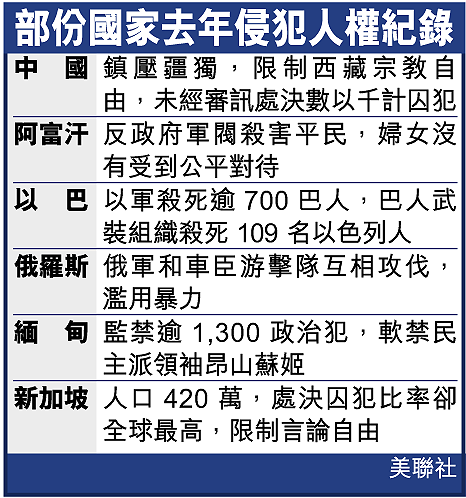 國際特赦組織周三公布本年度人權報告,炮轟世界各國背棄維護人權的承諾,美國公然虐待伊拉克和阿富汗前塔利班政權囚犯,更為漠視人權風氣「定調」。