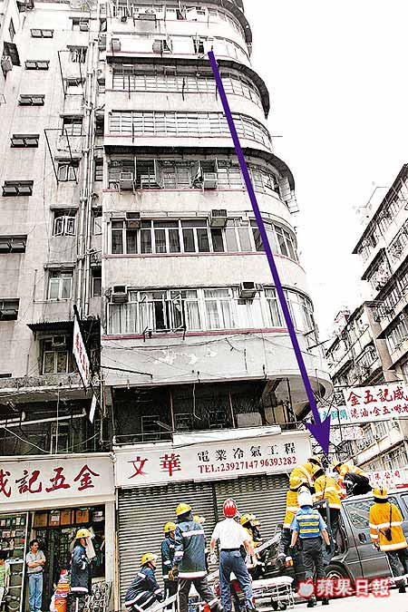 【本報訊】大角嘴昨日發生驚險墮樓事件,一名男子疑毒癮發作辛苦難當,從七樓躍下自殺,恰巧跌在一輛停泊在路邊的客貨車車頂,將車頂壓凹,擋風玻璃亦告爆裂,車上一名男子幸僅頸項扭傷。墮樓男子急救後,終告不治。 記者:張家樂