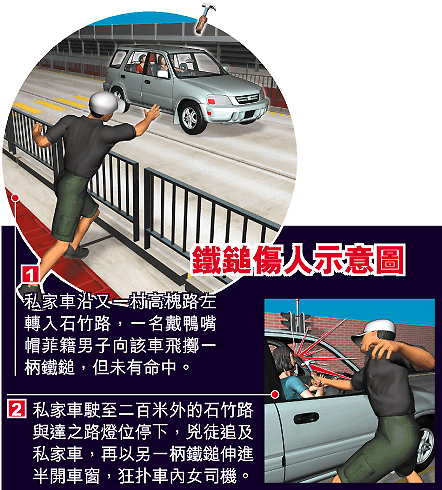 【本報訊】九龍塘發生鐵鎚飛擲私家車及扑頭襲擊女司機血案。一間跨國網上圖片公司前高級職員的妻子,昨早送子女上學後載着菲傭往街市買餸途中,在又一村遭一名菲籍兇徒從路邊飛擲鐵鎚掟向私家車,鐵鎚未有命中後,兇徒趁車在交通燈位停下時,追前二百米再用鐵鎚狂扑女司機頭部,逞兇後始逃去。女司機傷勢無大礙,警方懷疑血案涉及租務糾紛。 記者:潘志能、羅日昇