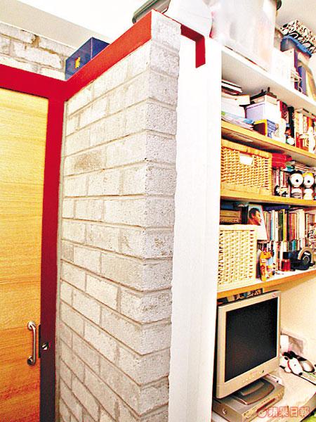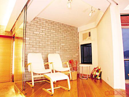 鋪上木地台的廳,分為兩部份,一個是面海的客廳,另一邊是磚牆小偏廳。最特別是一道磚牆,營造原始感覺,簡簡單單放兩張木椅和數個咕𠱸就好舒服。Beatrix說:「用的是砂磚,不算太重。砌一道這樣的磚牆約需三日,要約$4,000。雖然可以省回將牆身弄平滑的程序,但由於砌磚牆的人工較貴,所以價錢其實跟掃漆油差不多。但潮濕天就不會像普通牆出水。」