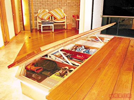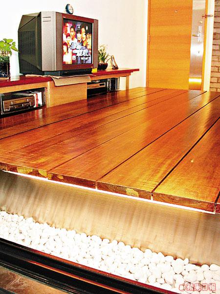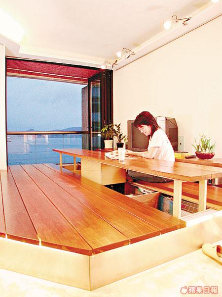 離地十吋高的木地台,用的木是造船的木,從船廠買回來。做地台的好處很多人都知,可以方便存放雜物。但更估不倒,屋主將一張長枱都收埋入去。要使用時就按動電掣,長木枱緩緩升起自動現身,足夠坐八個人,家姐阿哥返屋企開家庭會議都夠坐。