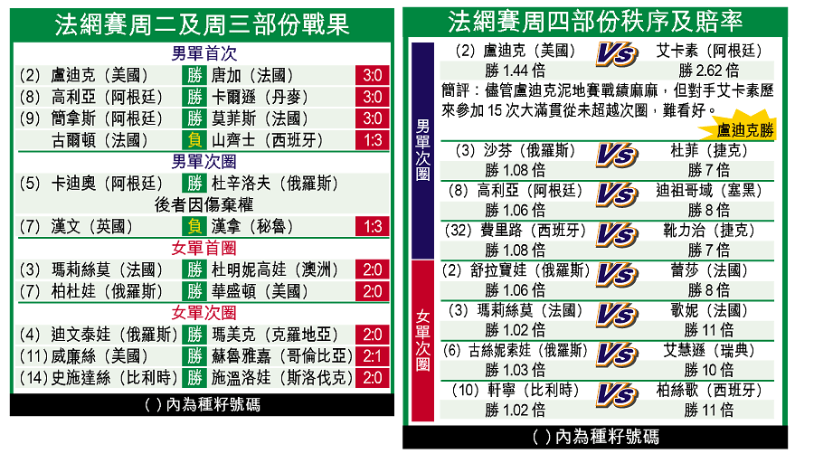 英國球手漢文未能連續第二年在法國網球公開賽創造「奇迹」,周三在男單次圈以一比三受挫秘魯的漢拿止步;美國的威廉絲及俄羅斯的迪文泰娃亦要克服嚴厲考驗,才艱苦過關。(有線體育台今日4:30pm起直播周四賽事)