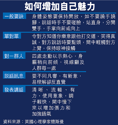 他指出,有魅力的人有三個特點,第一是自己對情緒有強烈感受,第二是能引發他人感受同樣情緒,第三是自己不受其他魅力人士影響。他估計,這些特質一半天生、一半後天培養,很大程度與身體語言和溝通技巧有關(見表)。