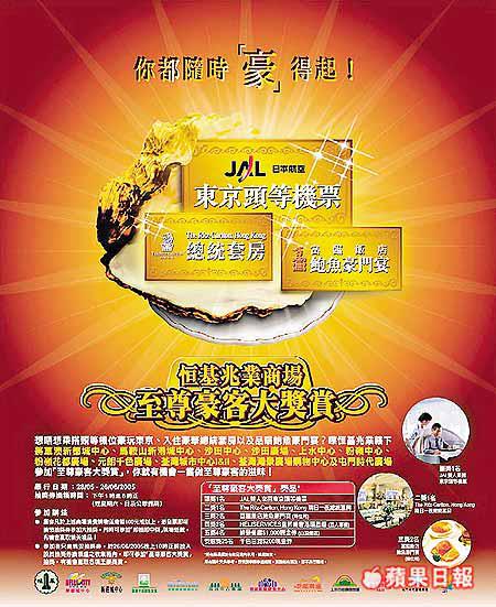 父親節將至,恒基為催谷十一個商場人流與消費,未來四星期,花費一百大元就可以抽獎,頭獎雙人頭等機票來回東京,二獎係麗嘉酒店雙人總統套房一晚,三獎都有雙人富臨飯店鮑魚豪門宴。