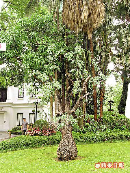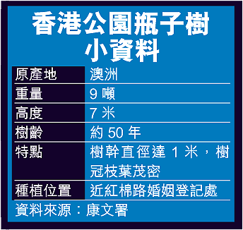 康樂及文化事務署昨日用吊臂車將該棵瓶子樹搬到香港公園,並要出動五名工人才成功令它落地歸根。要如此大陣仗,皆因它重九噸、高七米,樹幹直徑達一米。它並不年輕,原來已經有五十歲了。