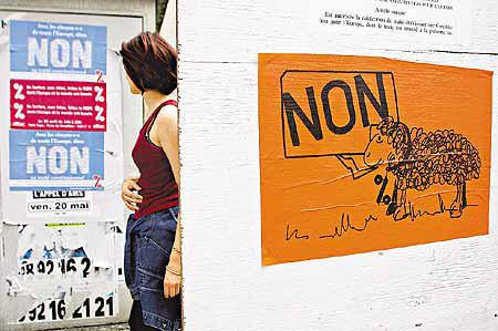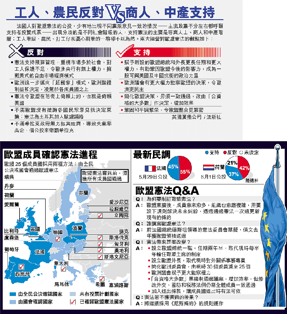 歐洲聯盟的第一部憲法,明日面臨生死關頭。法國半世紀前發起歐洲統一大業,可是周日的確認歐盟憲法全民公決(公投)告急,連續十三個民意調查都顯示反對票佔多數。總統希拉克周四晚臨危作出最後一擊,神色凝重地發表電視演說,呼籲國民為了法國,為了歐盟,為了後代,投贊成票,但輿論認為他將無法力挽狂瀾。