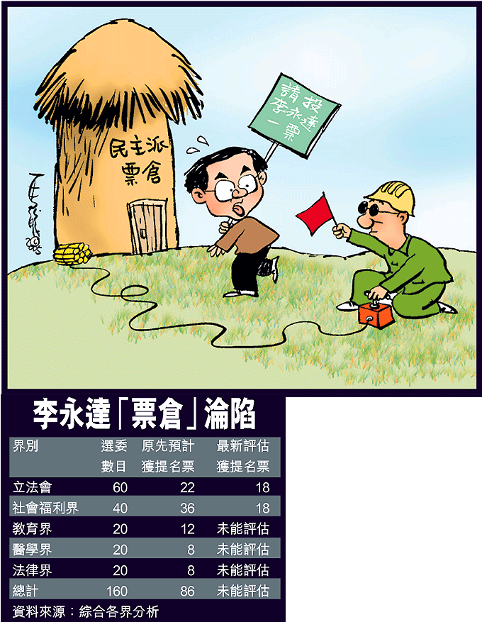 【本報訊】距離特首選舉提名期愈近,中央態度愈見緊張,據了解,已宣布參選的民主黨主席李永達擁有的基本「票倉」,近期在中央出招下被逐一攻陷,其中重災區為社會福利界,最初擬按民調結果統一投票的三十六名社福界選委,有意取消進行民調,任由選委自由提名,令李永達可獲提名數目大跌,能獲一百提名的希望漸告幻滅,令曾蔭權在無對手下當選的機會高唱入雲。 記者:許偉賢