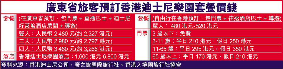 香港迪士尼樂園每日限制三萬至三萬五千人入場,大部份門票都會通過旅行社預售,迪士尼本身只負責當天的門票銷售。據廣之旅透露,根據協定,該社每月將代理超過一萬張迪士尼門票,從九月開幕至國慶黃金周期間,獲得超過五百間酒店客房的配額。其實目前發售迪士尼旅遊套餐的旅行社不只一間,廣東鐵路青年旅行社、國旅假期及南湖國旅均已發售套餐。
