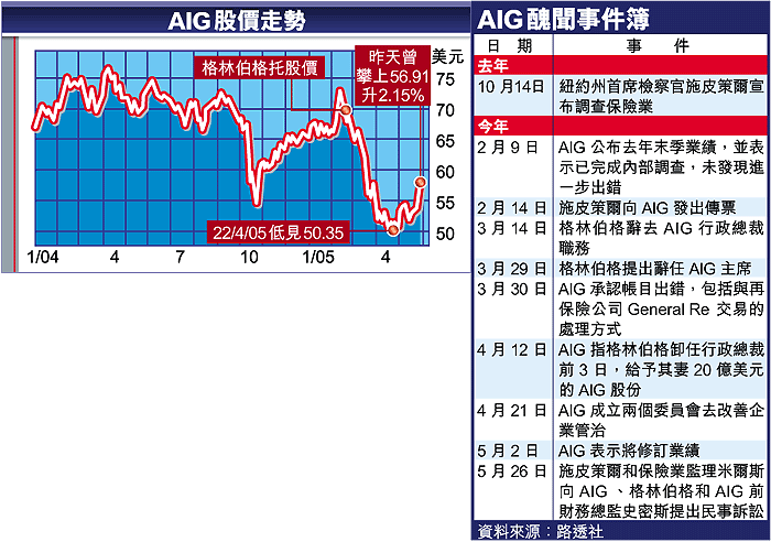【本報綜合報道】全球最大保險公司美國國際集團(AIG)及兩名前高層──行政總裁格林伯格(MauriceGreenberg)和財務總監史密斯(HowardSmith),遭紐約州當局控以民事欺詐罪名。格林伯格除了涉嫌造假帳,亦被指曾操控股價。這是當局首次就AIG的會計錯誤採取法律行動。