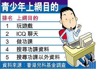 【本報訊】一項調查發現,約三成半受訪中學生及一成半受訪小學生每日上網超過三小時,多是玩遊戲及與網友ICQ聊天。有學生稱,知道上網會影響視力、容易沉迷,並導致睡眠不足。有醫生更警告上網時間太長會導致精神衰弱。