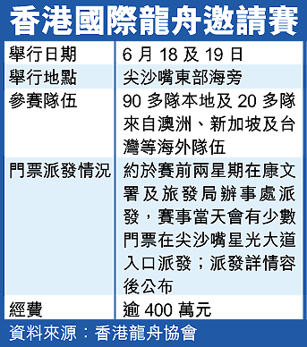 【本報訊】一年一度香港國際龍舟邀請賽將於下月中舉行,今年賽事場地更由沙田城門河,重返闊別九年的尖沙嘴東部海旁,經費也因所需安全設施較嚴格而增加三分一至四百多萬元,賽事料可因維港景色較美而吸引更多旅客來港觀賽,帶來更多經濟裨益。