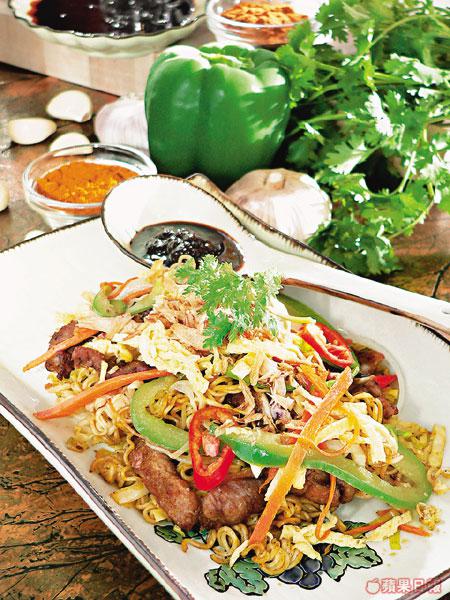 出前一丁做麵底,貪其麵條較硬淨易炒,加秘製咖喱粉炒得乾身,確保少油及麵條乾爽,配料有豬柳、雞柳、五香肉丁或牛肉選擇,蘸台灣勁辣XO咖喱醬吃。