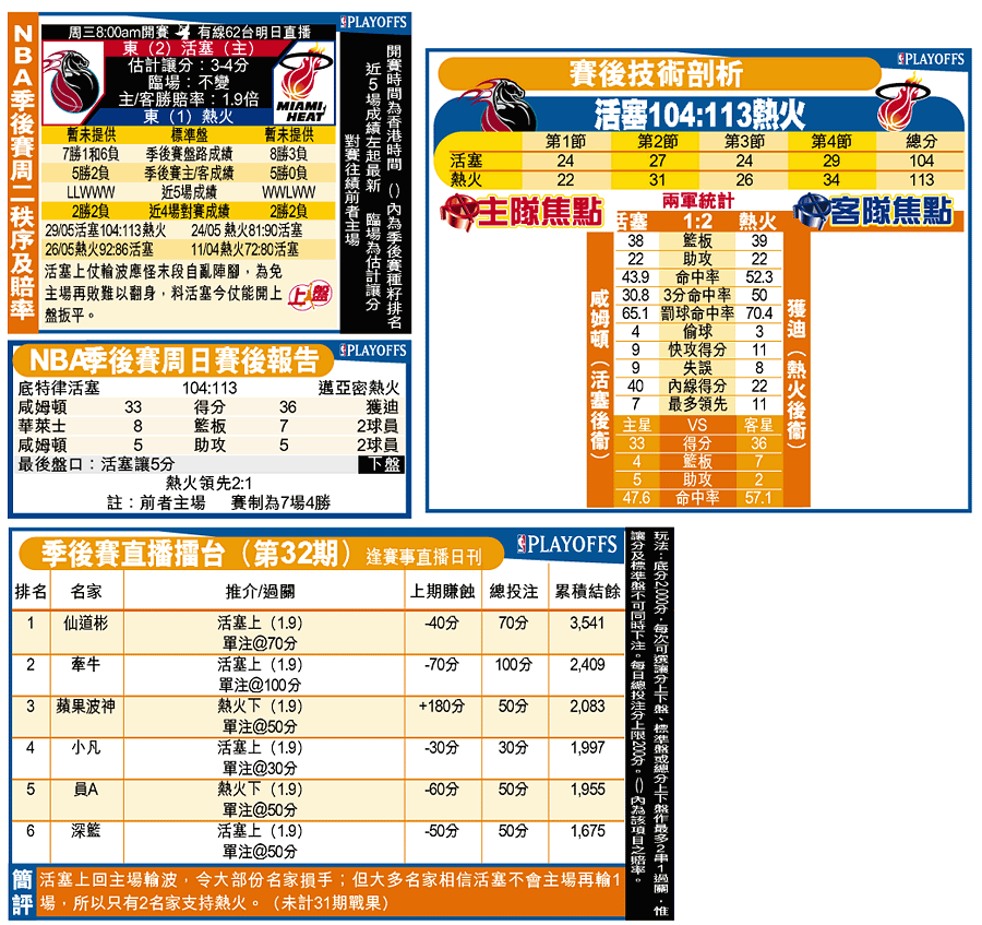 邁亞密熱火憑奧尼爾及獲迪發揮水準,周日作客以一百一十三比一百零四,壓過自亂陣腳的底特律活塞,在東岸決賽領先二比一。不過衞冕的活塞經驗十足,周二定於主場沉着應戰,臨場讓三至四分仍值捧上盤。(有線62台明日8:00am直播)仙道彬