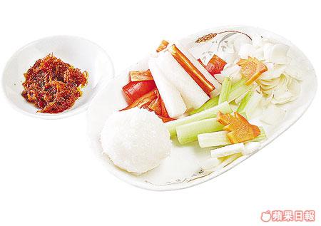 西芹和沙葛各両半,百合、馬蹄和紅椒各少許、花枝膠2両、蝦米醬1湯匙