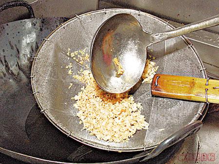飯粒要炒到粒粒分明,就要事前將之沖水,炸時要不停攪拌,讓飯粒不會黏在一起。炸飯粒時要慢火耐心炸,才不會焦燶。