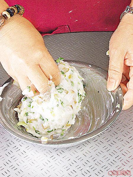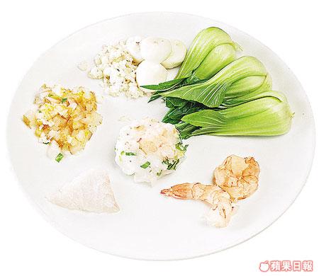 小棠菜3棵、石斑魚肉及蝦仁各1両、墨魚膠2両、馬蹄和海參各少許、鹽及胡椒適量