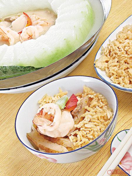 冬瓜半斤、中蝦6隻、帶子4隻、海參4両、鹹瘦肉4両、白飯2碗、魚湯2碗