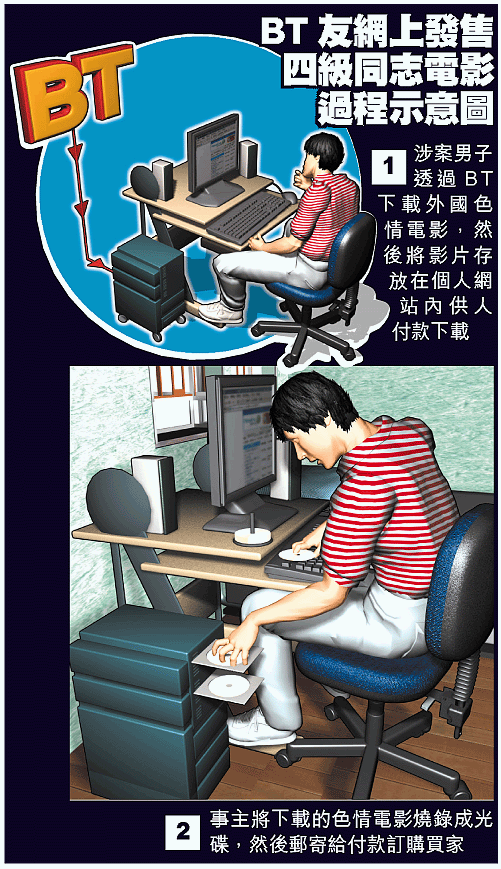 警方消息稱,被捕男子有同性戀傾向,他的「創業」方式,是先經BT「點對點」,從外國一些色情網站下載描述男女同性戀的三、四級色情電影,存放在個人網站內。然後透過網站,向海外的「同志」推銷該類色情電影。買家需繳付入會費,加入其網站成為會員,然後選擇在其網站直接下載電影,或訂購該類電影的光碟。