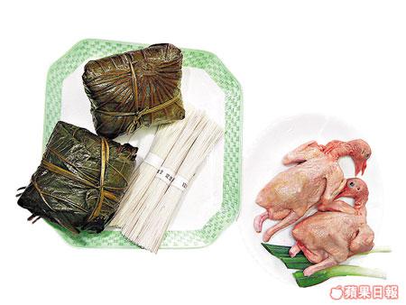 裹蒸糭1隻、BB鴿2隻、宮麵1紮、葱1棵、薑數片