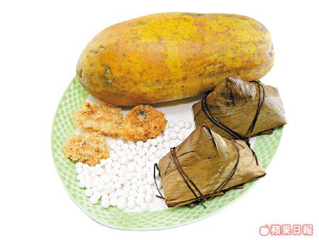 翠亨邨今年推出的金桔鹼水糭,糭身帶有一點點的金桔香味,Maria說木瓜雪耳糖水清潤香甜,配以這些有金桔味的鹼水糭份外香口,在炎夏雪凍來吃更為滋潤及消暑。