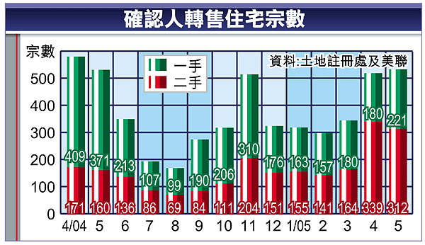 購入二手樓再摸售的登記,連續兩個月高於300宗,5月份個別屋苑如天水圍嘉湖山莊有37宗登記,荃灣中心佔12宗。至於向發展商購入全新貨後摸出的個案有221宗,較4月的180宗多22.8%。登記量較多的新盤,以長沙灣宇晴軒居首,共73宗,其次為將軍澳蔚藍灣畔的48宗,及東涌映灣園的39宗。