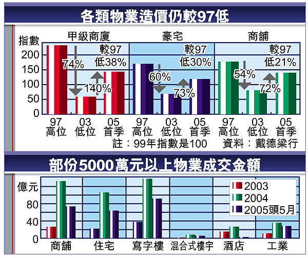 據戴德梁行統計,今年首5個月,逾5000萬元的大額物業成交,涉資近270億元,超過去年一半,以寫字樓最突出,約共90億元,其次是商舖和豪宅,分別是70餘億及60餘億元,三者均較03年全年成交總額高。