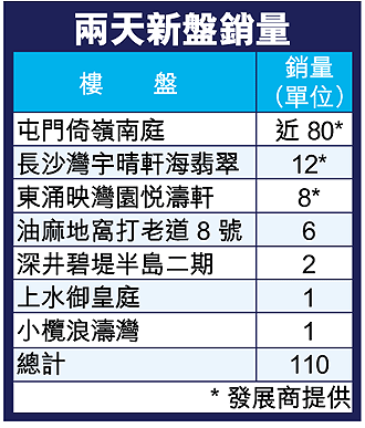 受到銀行上周突然調高新造樓按息率影響,新盤成交過去兩天十分淡靜,雖有110宗,較前周多1.08倍,但集中在首度公眾內購的屯門倚嶺南庭,近80宗佔73%,反映貨尾銷情持續淡靜。