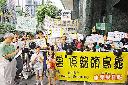 另外,前綫立法會議員劉慧卿、街工梁耀忠及泛民主派張超雄,昨聯同近五十名基層代表,前往灣仔曾蔭權競選辦公室請願,抗議曾拒絕出席政綱諮詢會,不敢面向市民,並即席上演街頭劇,諷刺曾為縮頭烏龜。最後由競選辦公關游淑儀接收請願信。