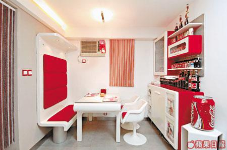着住可樂Tee的Sunny自言一向同紅色有緣:「本身已很喜歡紅色,又鍾意可樂嘢,甚至讀書時的學校Team衫,自己喜歡的球隊(阿仙奴)都係紅色,可能真係有緣啩!」所以結婚後同太太Maggie擁有自己天地,都要做到一屋紅白。要紅白,當然因為想要襯番可樂的形象!另外木製家具要做到外表有塑膠感、要光身要令面,所有家具要圓角,亦要飯廳設有一邊卡座的設計,起碼咁先叫貫徹番整個Tone。