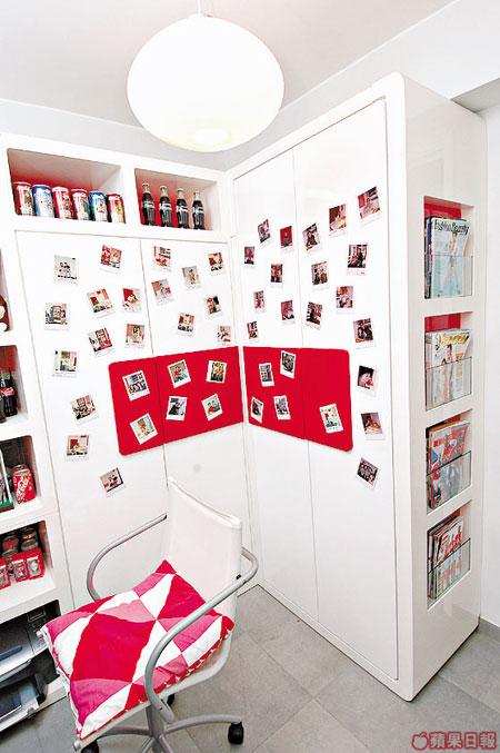 全屋凡是紅白色的儲物櫃都用作擺放可樂了,真要多想點辦法來騰出更多空間不可。所以近年極為流行的提升地台、床板底部和雜誌架儲物櫃兩用的設計絕不能缺。