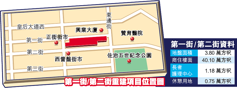西營盤項目地盤約3.8萬方呎,總樓面不逾42.5萬方呎。初步計劃住宅及商舖樓面各約38.2萬及1.9萬方呎,建2幢38層高住宅,提供600個單位,另有1.18萬方呎的長者護理中心,及7500方呎休憩用地。
