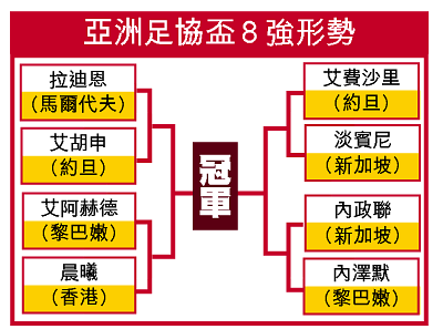 亞洲球會級最高榮譽兩項賽事,冠軍聯賽盃及足協盃,昨日在吉隆坡亞洲足協總部舉行抽籤儀式。首次參賽即贏得小組首名的晨曦,將與艾阿赫德爭入四強。八強將於九月十四日展開,賽制採主客場淘汰方式至產生冠軍。若然晨曦出線,次圈將遇馬爾代夫拉迪恩或約旦艾胡申之勝方。