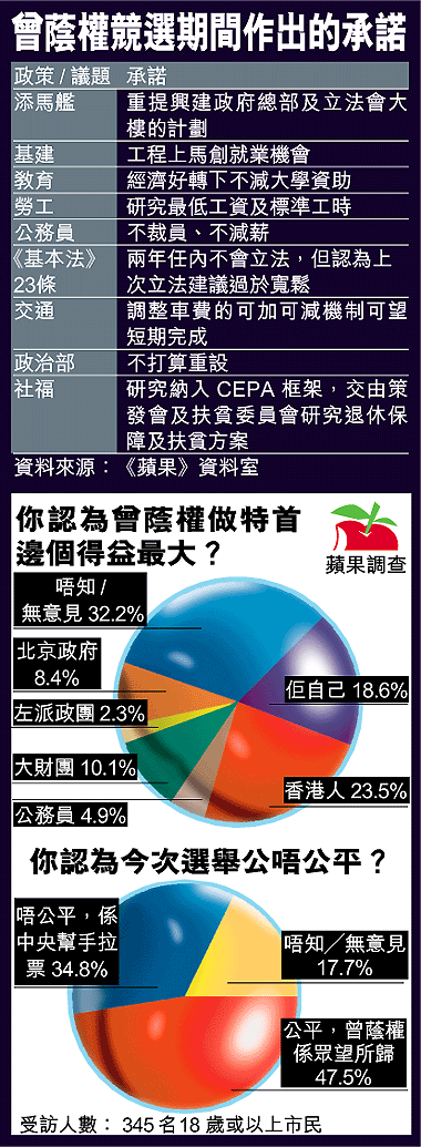 【本報訊】曾蔭權過去兩周爭取選委提名過程中,向不同界別許下不少承諾,如答應勞工界交由策略發展委員會研究設立最低工資及標準工時;應允社會福利界考慮將社福服務納入更緊密經貿關係「CEPA」框架等,雖然其部份承諾實是政府已有的政策或計劃,但有學者認為,為確保自己兩年後再次參選特首時能獲得支持,曾蔭權不能只說不做,因此「會有餅仔派,只不過普羅大眾未必有得分。」 記者:陳沛敏