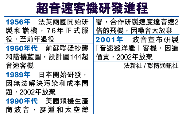 法國和英國合製的超音速和諧機(Concorde),前年告別天空,走進歷史。不過,和諧機是航空經典之作,法國人捨不得它退役,日本人更想用新一代超音速客機,一圓航空大國美夢。結果,兩國周二在巴黎航空展上簽署協議,要在未來三年攜手打造出「超級和諧機」(Super-Concorde)。如果成功,由日本東京飛往紐約只需六個半小時。